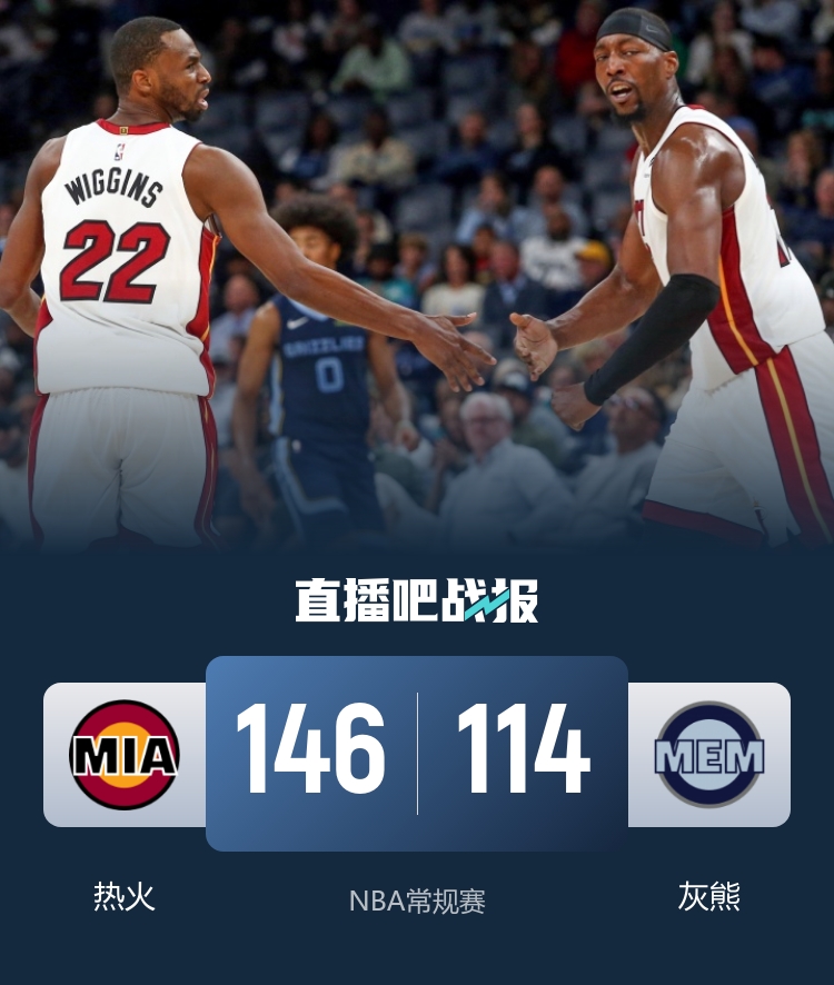 热火8人上双大胜灰熊 阿德巴约24+5 约维奇20+7 莫兰特12+6